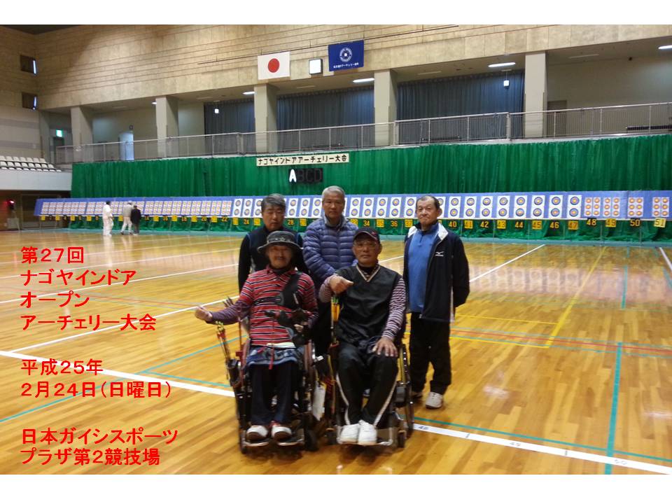 - 第27回ナゴヤインドアオープンアーチェリー大会 平成25年2月24日(日曜日) 日本ガイシスポーツプラザ第2競技場 参加者197名(内クラブ員5名) RC部門 成年男子A 1名 CP部門 男女混合 4名 ・今期最終戦インドア大会でした。 ・大会はABCD4立で前、後半伴に2時間30分の長時間戦となりましたが全員頑張りインドアシーズンを終わる事が出来ました。