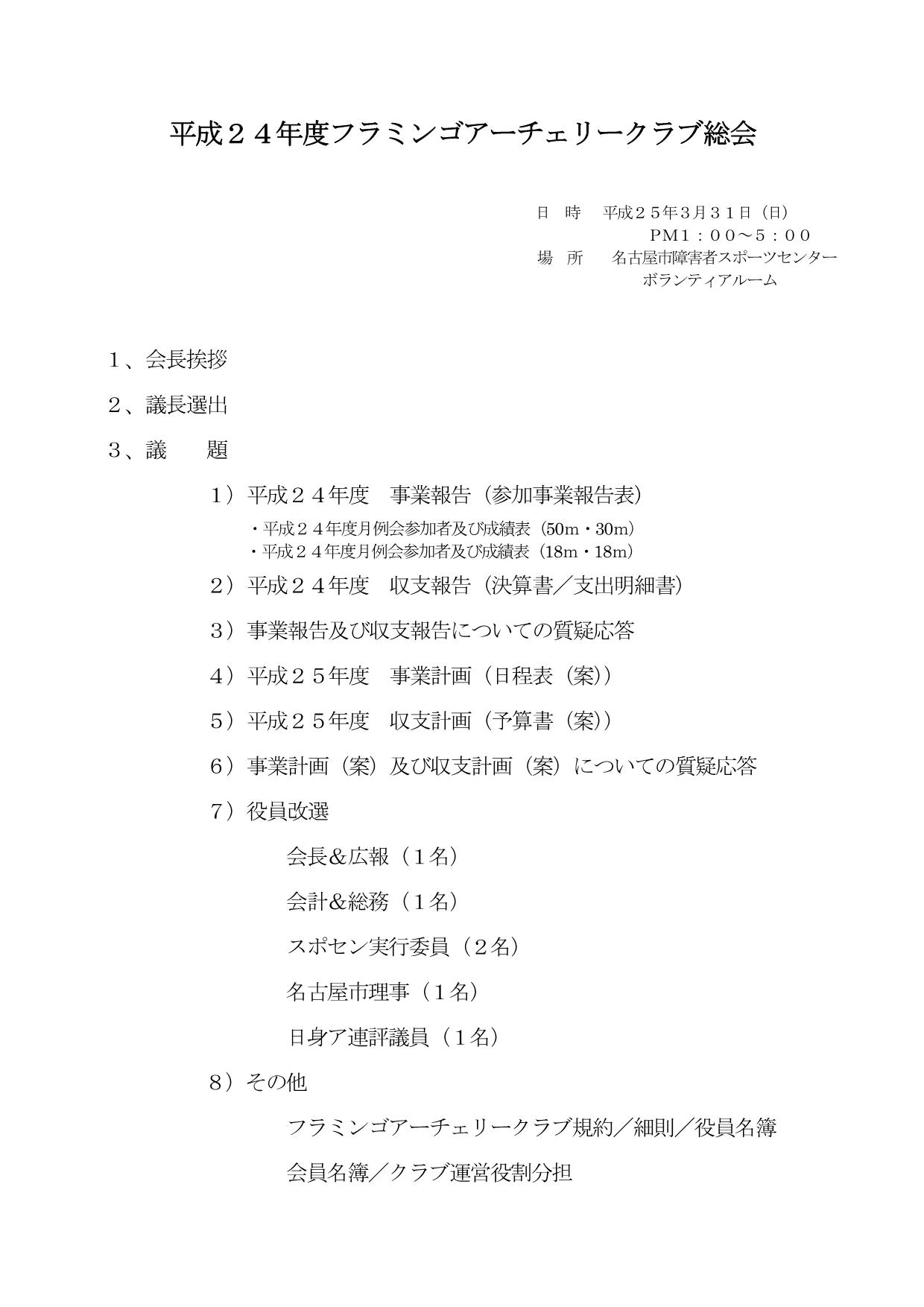- 平成24年度フラミンゴアーチェリークラブ総会 ・開催日 平成25年3月31日(日曜日) ・時間 午後1時30分~ ・場所 名古屋市障害者スポーツセンターボランティアルーム ・議題 添付資料参照