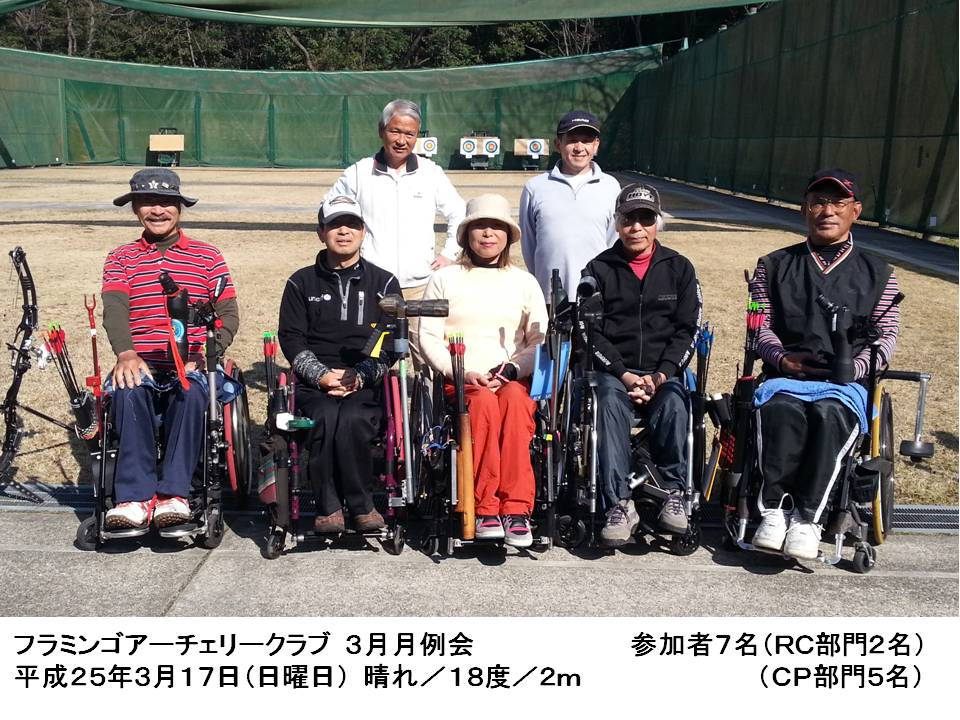 - フラミンゴアーチェリークラブ3月月例会 平成25年3月17日(日曜日) 猪高緑地アーチェリー場 参加者 7名 RC部門 2名 CP部門 5名 ・今年度最終戦の月例会で、ターゲットシーズンに向かって50m・30mで実施しました ・絶好のアーチェリー日和で全員が久し短距離を楽しく射ち今シーズンに向けてのアベレージアップに健闘しました。