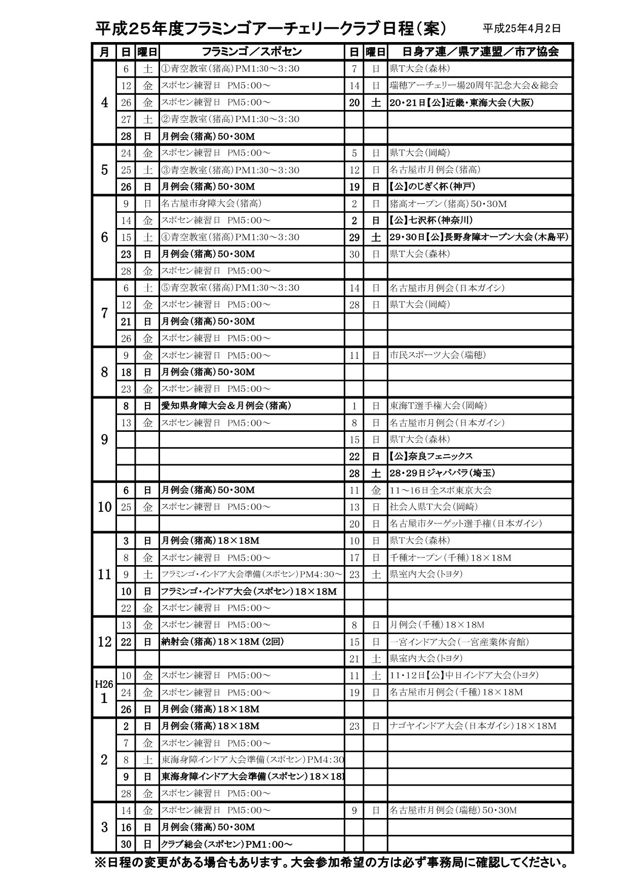 - 平成25年度フラミンゴアーチェリークラブ予定表