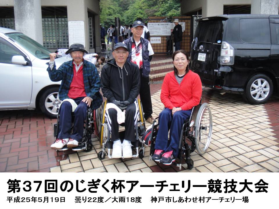 - 第37回のじぎく杯アーチェリー競技大会 平成25年5月19日(日曜日) 神戸市北区しあわせの村アーチェリー場 曇り22度2m~大雨18度2m~曇り20度1m シングルラウンド参加者(34名/4名) RC部門12名(1名) CP部門22名(3名) ・試合開始時は日差しが有ったが90m終了間際から雨が降り出し大雨での試合終了でした。 ・冷雨で体調不良でリタイヤ数名で大変でしたが1