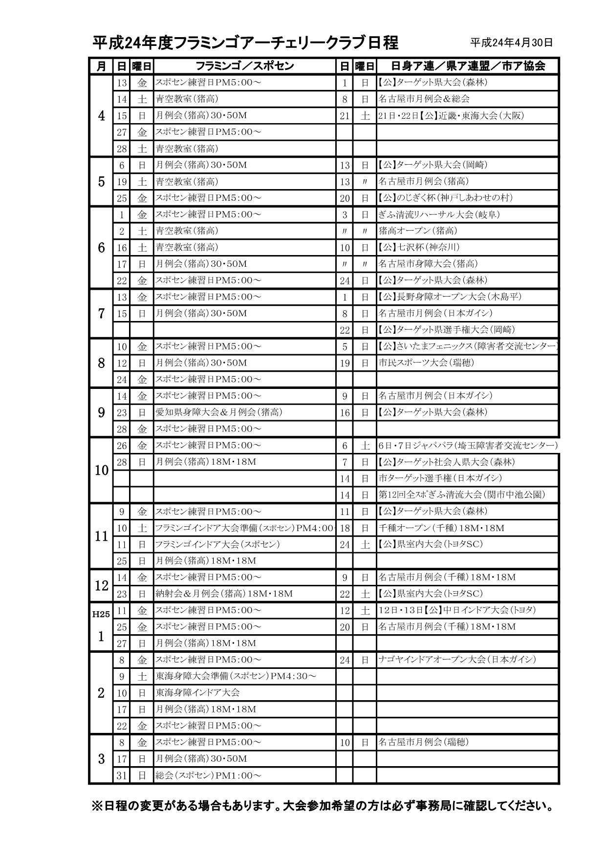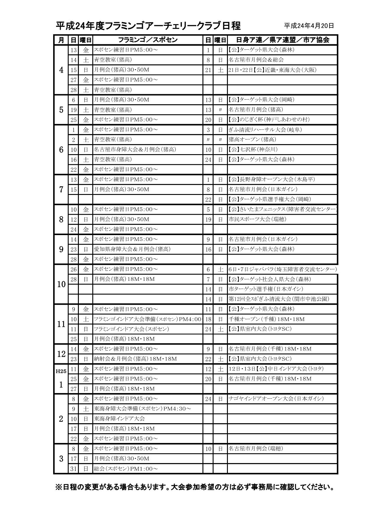 - 平成24年度 フラミンゴアーチェリークラブ日程表 H24.4