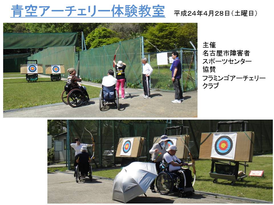 - 1.目的 アーチェリーに興味があり室外のアーチェリー場で体験参加し日常生活の活性化を図る。 2.開催日 4月28日(土曜日) 午後13時30分~15時30分 3.開催場所 猪高緑地アーチェリー場 4.主催 名古屋市障害者スポーツセンター 5.協賛 フラミンゴアーチェリークラブ 6.コメント 真夏を思わせる快晴29度での開催でした。 第2回目で参加者4名と少1