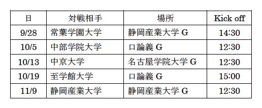 - 10/19 至学館大学と対戦し0−1で負けました。 応援に来ていただいた皆様、勝利をお見せすることができず、申し訳ありません。 インカレ予選は、あと静岡産業大学との試合が残っています。 悔いの残らないよう、精一杯戦いたいと思います。 また、東海リーグ1部昇格を目指し、あと3試合、チーム一丸となって頑張りますので、応援よろしくお願いいたします。