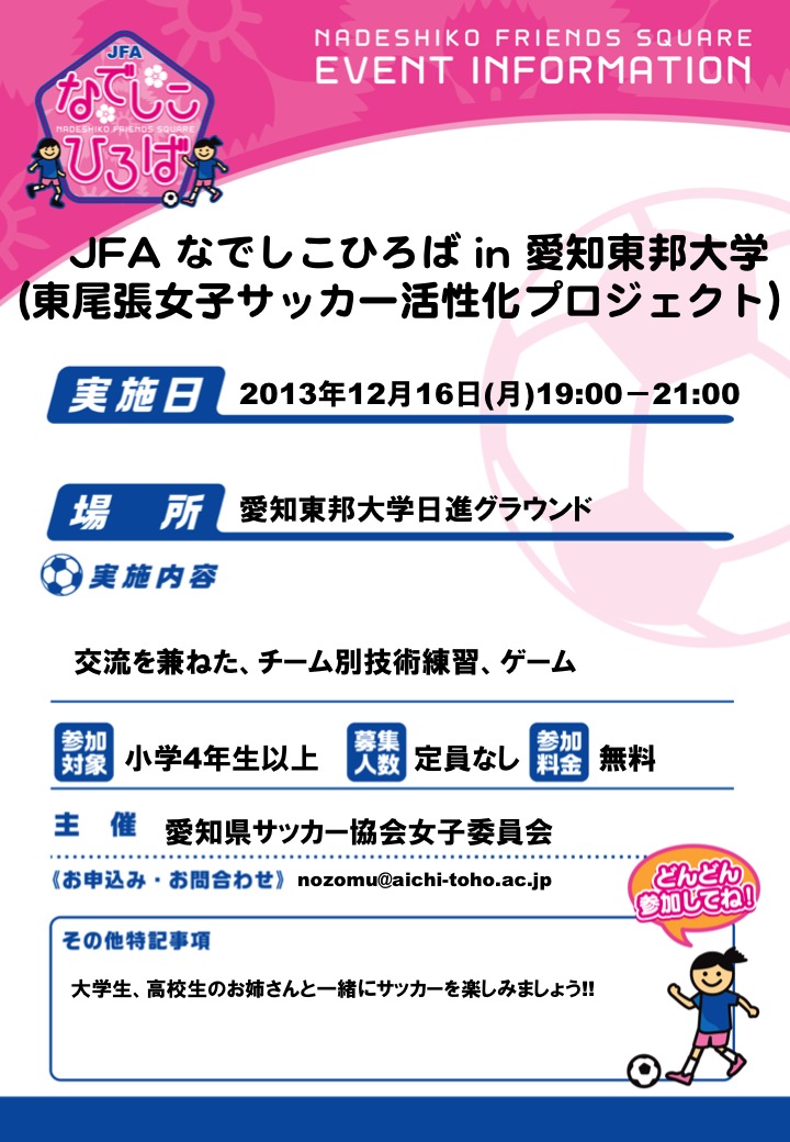 - 12月16日(月)愛知東邦大学日進グラウンドにて、「JFAなでしこひろばin愛知東邦大学(東尾張女子サッカー活性化プロジェクト)」を19時より開催します。 対象は、小学校4年生以上の女子です。 サッカーをやってみたいと思っている女の子は是非、参加してみて下さい。